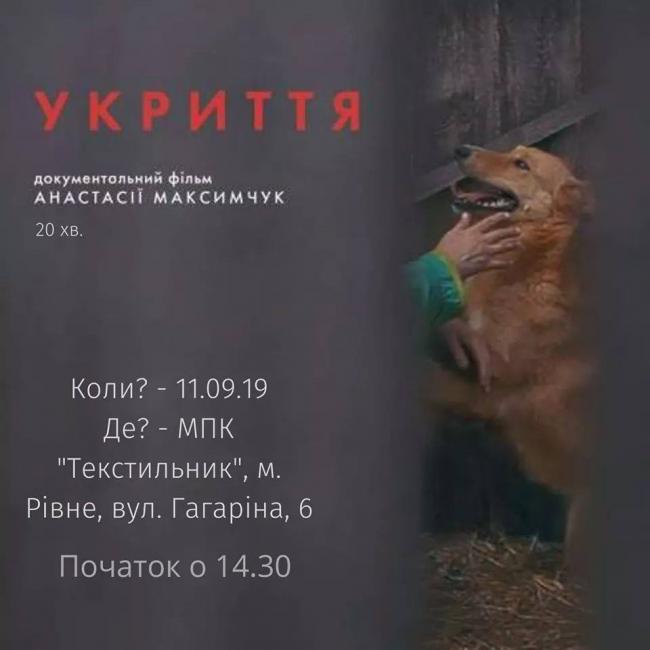 «Укриття» – фільм про історію зоозахисника і доґхантера, які стикаються в невидимій війні за визначення поняття людяності в країні, де громадяни занадто часто змушені діяти замість уряду. Показ організовується у співпраці ГО «Еко-Проджект Груп», Рівненський Кіноклуб медіа просвіти з прав людини Docudays UA та Рівненської міської ради.