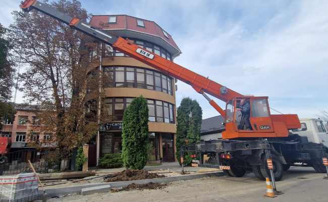 За допомогою підйомника комунальники уже замінили дві опори по вулиці Словацького та п’ять старих опор по вулиці Шевченка.