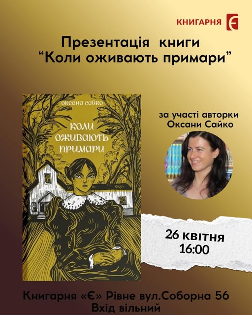 26 квітня у Рівному відбудеться презентація книги Оксани Сайко «Коли оживають примари». Це психологічний роман, у якому переплітаються реальність і містика, а минуле стає небезпечно близьким.