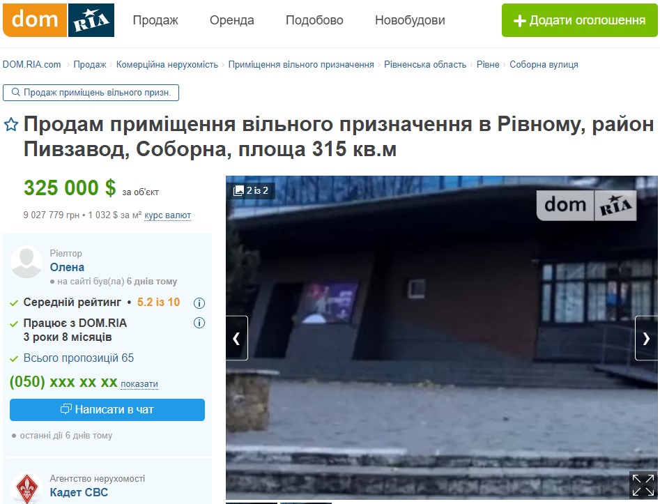 Продаж супроводжується агентством нерухомості “Кадет СВС”, яким, до слова, керує дружина першого заступника голови Рівненської облдержадміністрації Сергія Подоліна Інна.