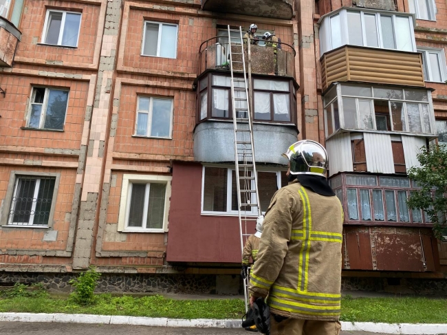 Сьогодні вранці рівненські вогнеборці отримали повідомлення про пожежу на балконі 3-го поверху житлового будинку по вулиці Соборній. Рятувальникам довелося лізти по драбині.