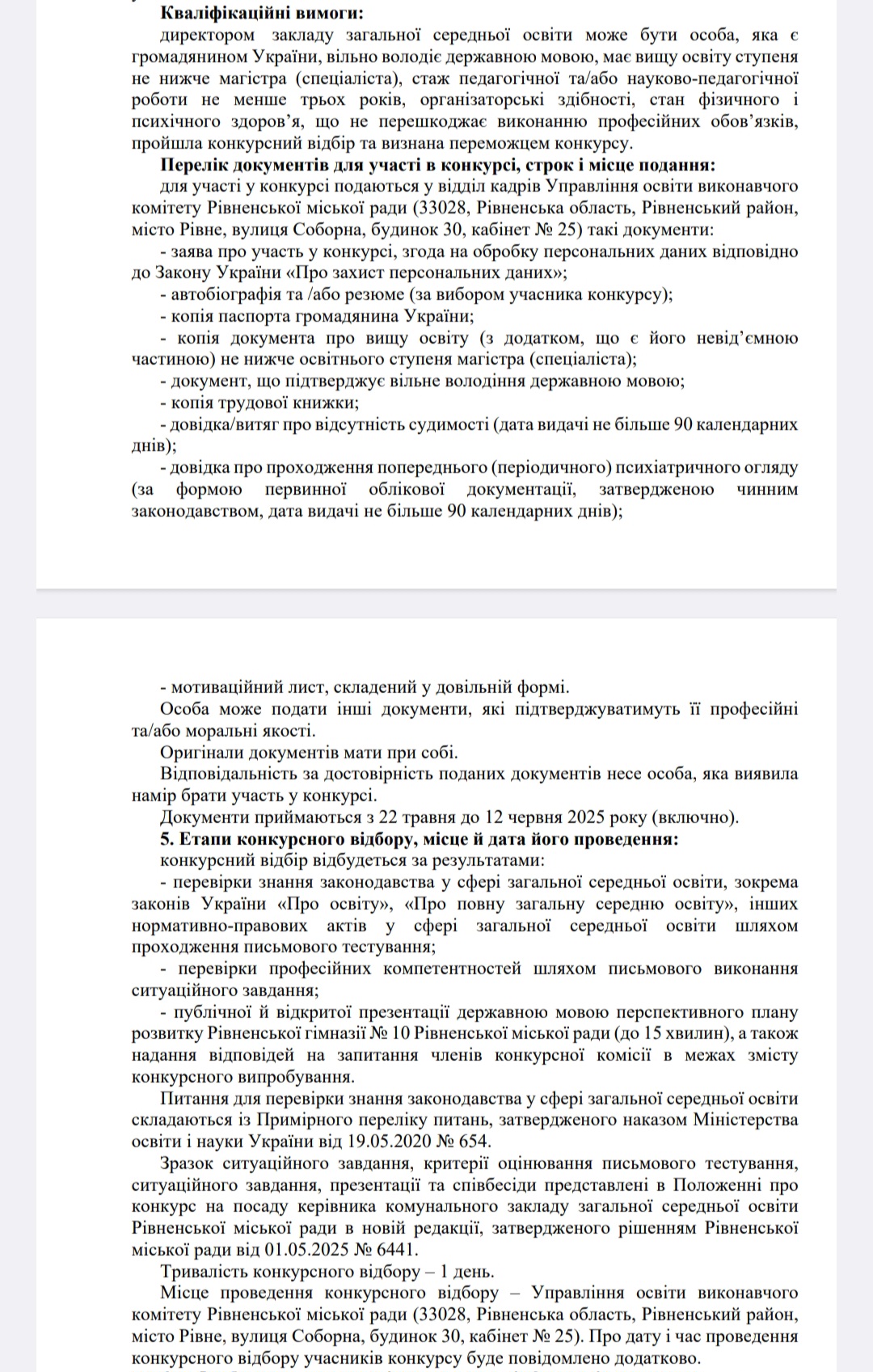Окрім подачі пакету необхідних документів, від кандидатів також очікують мотиваційний лист у довільній формі та презентацію плану розвитку закладу. Перевірятимуть і знання законодавства та професійну компетентність.