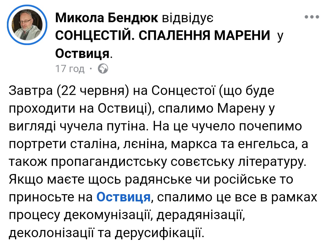 Новини У Рівному сьогодні спалять опудало путіна А поруч почеплять портрети вождів комунізму. admin 22 Червня, 15:10 0 хв. читання Поділитися Показали, як виглядатиме опудало, яке сьогодні увечері планують спалити у етнопарку Оствиця. Світлину оприлюднив на своїй фейсбук–сторінці відомий краєзнавець Микола Бендюк. Повернути товар без чека Чи можна їсти шоколад, який побілів Графік відключення електроенергії на Рівненщині 8 грудня У Рівному прощатимуться з молодим добровольцем Картопля у Рівному: не тільки українська, а й польська, з Єгипту… Поділитися цією статтею Facebook Telegram Копіювати посилання Приєднуйтесь 58тисСтежити1.2тисСтежити13.9тисСтежити6.1тисПідписатися Читайте нас у Telegram: тільки важливі та перевірені новини Новини 7 Грудня 2025 Повернути товар без чека 21:35 Чи можна їсти шоколад, який побілів 21:17 Графік відключення електроенергії на Рівненщині 8 грудня 21:15 У Рівному прощатимуться з молодим добровольцем 21:00 Картопля у Рівному: не тільки українська, а й польська, з Єгипту… 20:10 На фронті загинув кваліфікований будівельник з Кореччини 18:30 Рівненський адвокат переконує, що розшук чоловіків за запитом ТЦК є незаконним 18:00 Фабрика біля Рівного робить продукцію для «IKEA» 17:20 У Рівному народився ще один малюк-«богатир» 16:51 Влада пояснила, чому на Рівненщині немає «світла» більше 10 годин 15:50 Всі новини