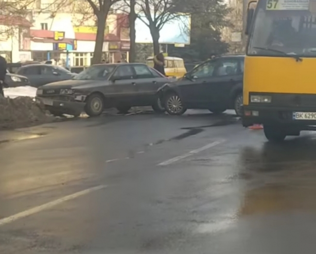 На відео видно, як на узбіччі стоїть автомобіль “Ауді” з пошкодженим переднім бампером. У нього врізався інший легковик.