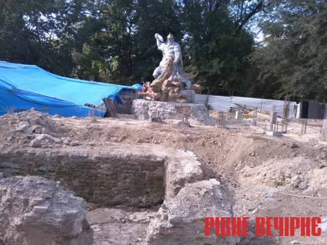 Зараз біля скульптури Іллі Муромця археологи укріплюють та обробляють спеціальними засобами кладку підземель. Реставраційні роботи триватимуть ще кілька тижнів.