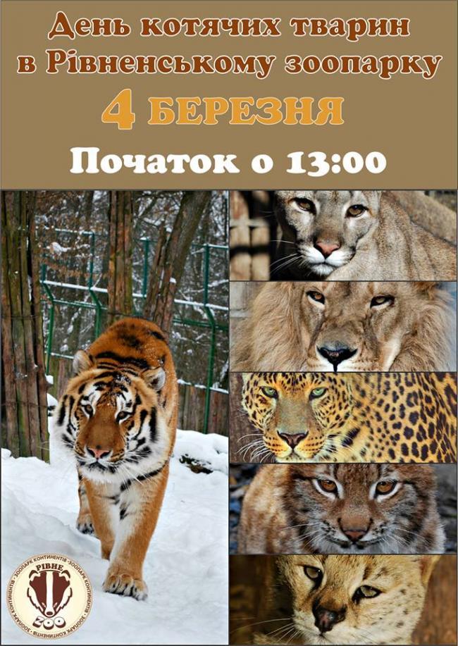 На рівнян чекають: цікаві розповіді, захоплюючі розваги для наших котячих та незабутня прогулянка зоопарком. О 13:00 – сервали, 13:20 – тигри, 13:35 – пуми, 13:55 – леопарди та о 14:10 – рисі.