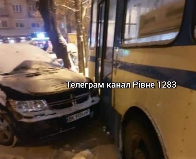Як повідомляють видно з фото у групі «Rivne_1283», тролейбус зіткнувся з автомобілем, який був припаркований неподалік арки входу до міського будинку культури.