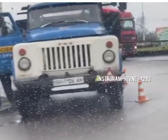 Відео опублікували на сторінці «rivne_1283» в Instagram. На відео видно учбову вантажівку та поряд легковий автомобіль на острівку.