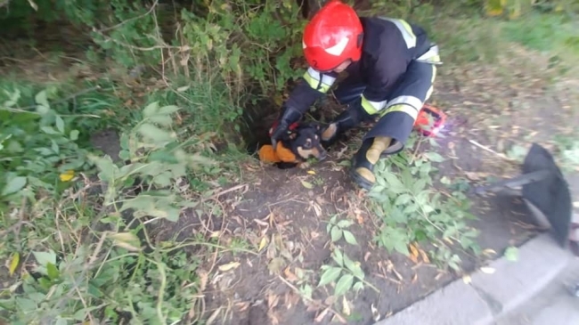 Один із рятувальників спустився у двометровий колодязь, взяв тварину та передав іншому рятувальнику.