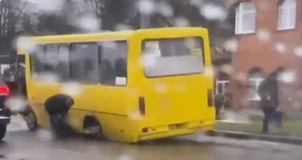На відео видно, як водій маршрутки намагається прилаштувати колесо назад.