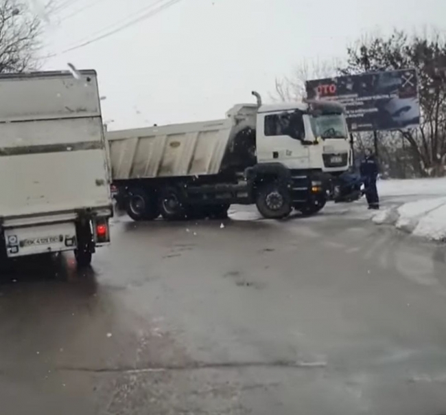 Водій вантажного автомобіля «MAN», повертаючи ліворуч не дотримався безпечного інтервалу та здійснив зіткненння з автомобілем «Renault Laguna».