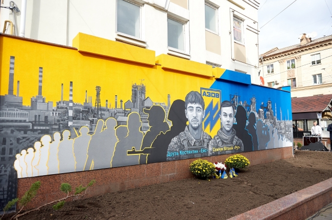 Сам стінопис складається з кількох елементів — тризуба, портретів захисників Маріуполя та малюнку дівчинки, яка обіймає Україну — як символу нашого майбутнього.