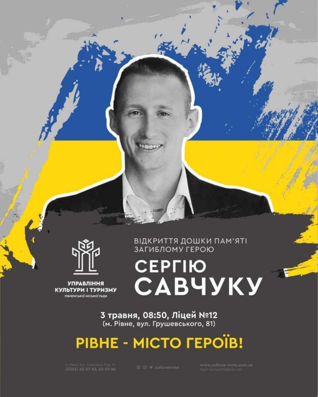 – Вшануємо пам’ять Героя разом! Завтра, 3 травня, о 08:50 на фасаді Ліцею 12 відбудеться відкриття дошки пам‘яті загиблому Герою Сергію Савчуку, – повідомляє секретар міської ради Віктор Шакирзян.
