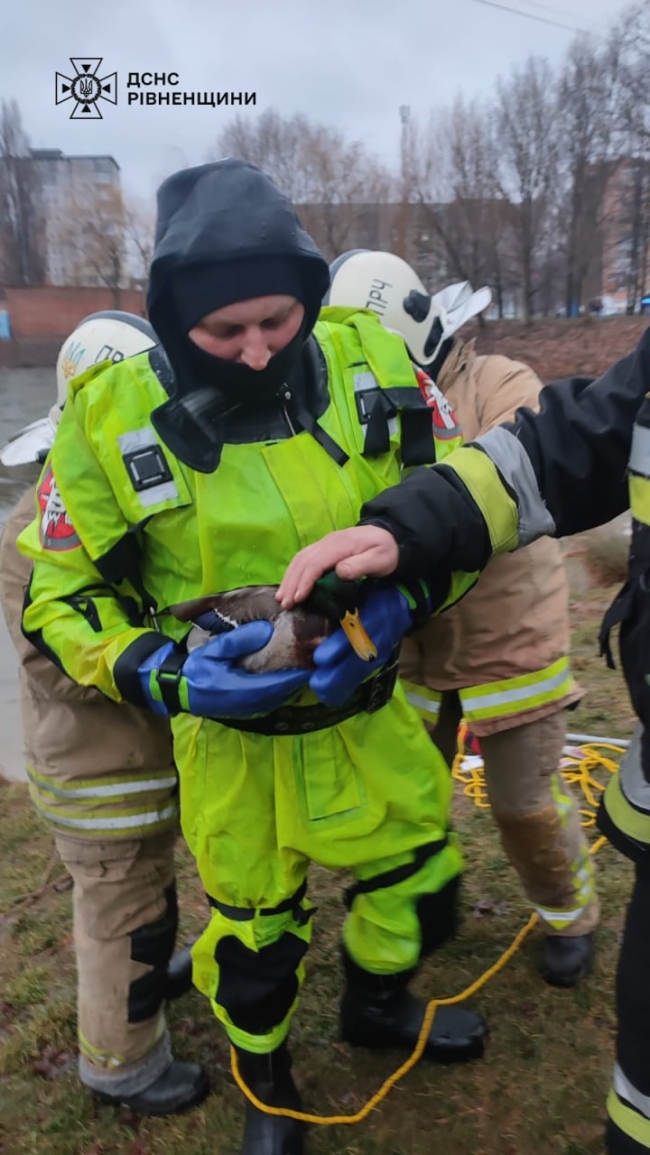 Рятувальник в спеціальному костюмі увійшов у воду та виніс птаха на берег, де передав представникам патрульної поліції, які відвезли селезня до Рівненського зоопарку. Ним будуть опікуватись спеціалісти.