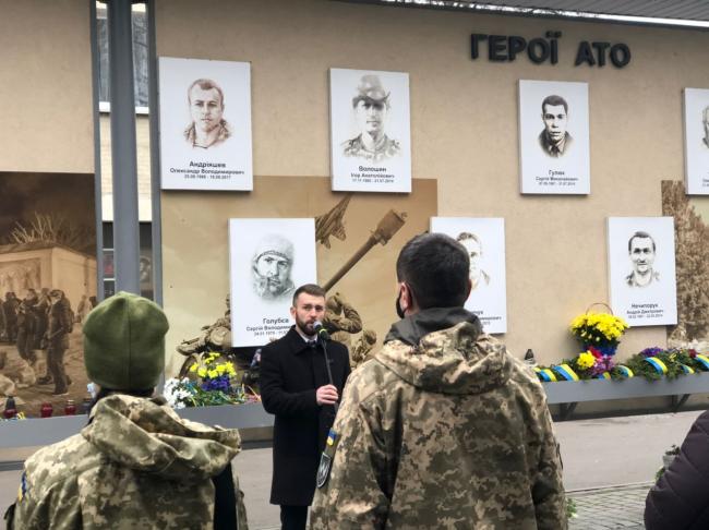Біля Дошки Пам’яті Героїв Небесної Сотні та Героїв, загиблим в АТО, що у центрі Рівного, присутні поклали квіти.