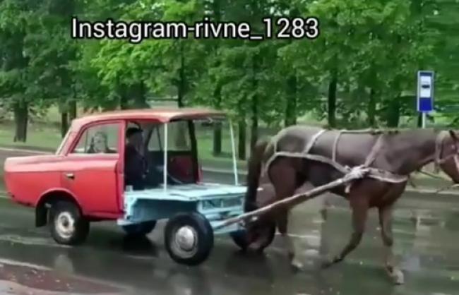 На відео видно як чоловік креативно переробив кузов автомобіля «Москвич» у воза, який тягне кінь.