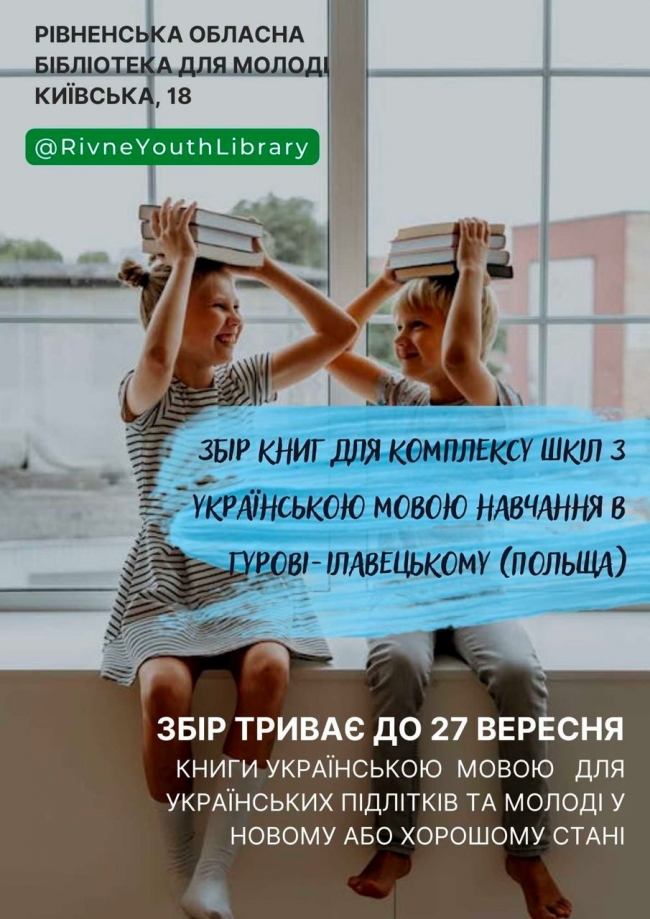 Збір триває до 27 вересня. Необхідні україномовні книги всіх жанрів для підлітків і молоді, нові або у гарному стані. Книги приймають за адресою м. Рівне, вул. Київська, 18.
