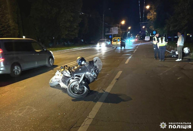 Водій іншого мотоцикла отримав забої та струс головного мозку, а у його 29-річної пасажирки – дружини, медики діагностували перелом кісток тазу.