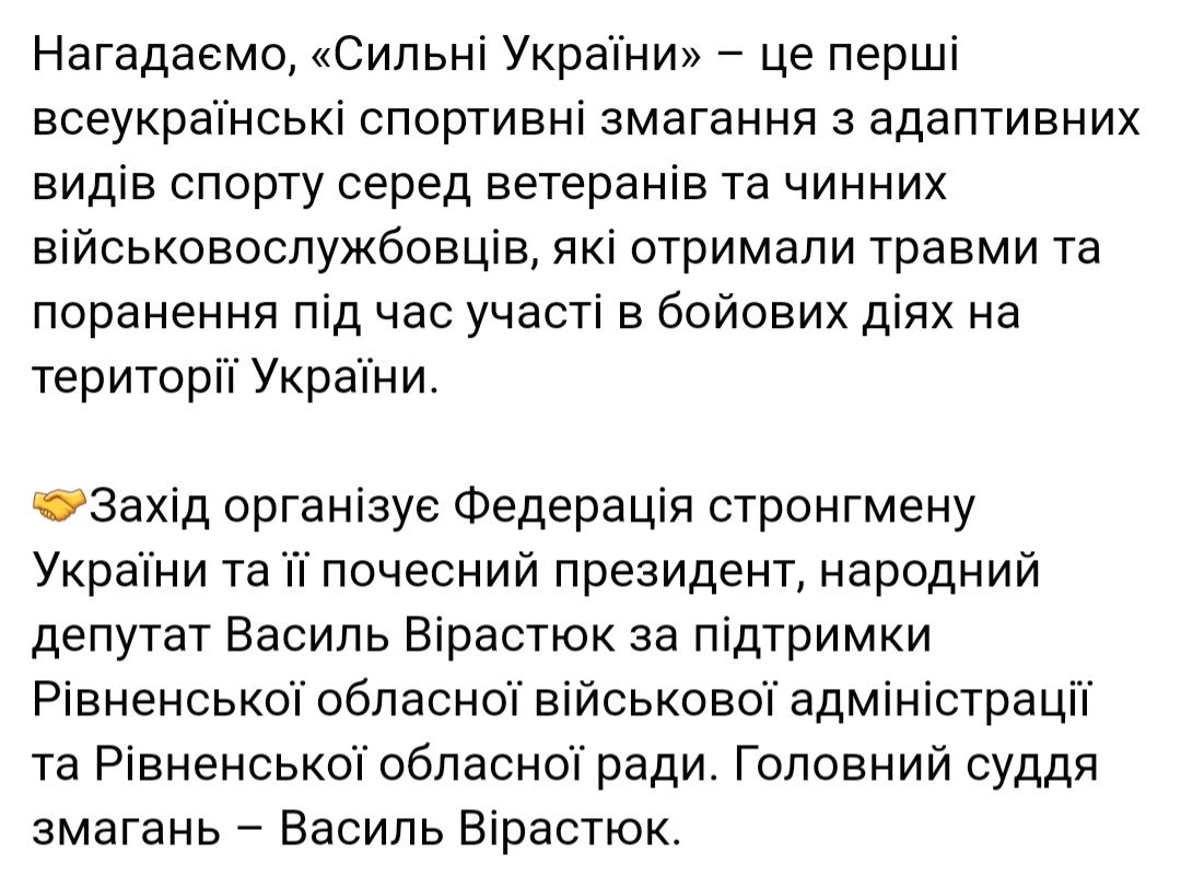 – Вітаю учасників фінальних змагань. Своїм прикладом вони надихають. Адже здорові та емоційно сильні люди – це те, що зараз потрібно Україні. А велика Перемога складається із маленьких, в тому числі і у спорті, – додає Коваль.