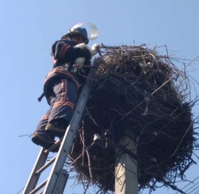 Фахівці за допомогою спецтехніки здійнялися на опорний стовп, де знаходиться гніздо, й повернули дитинча лелеки додому.