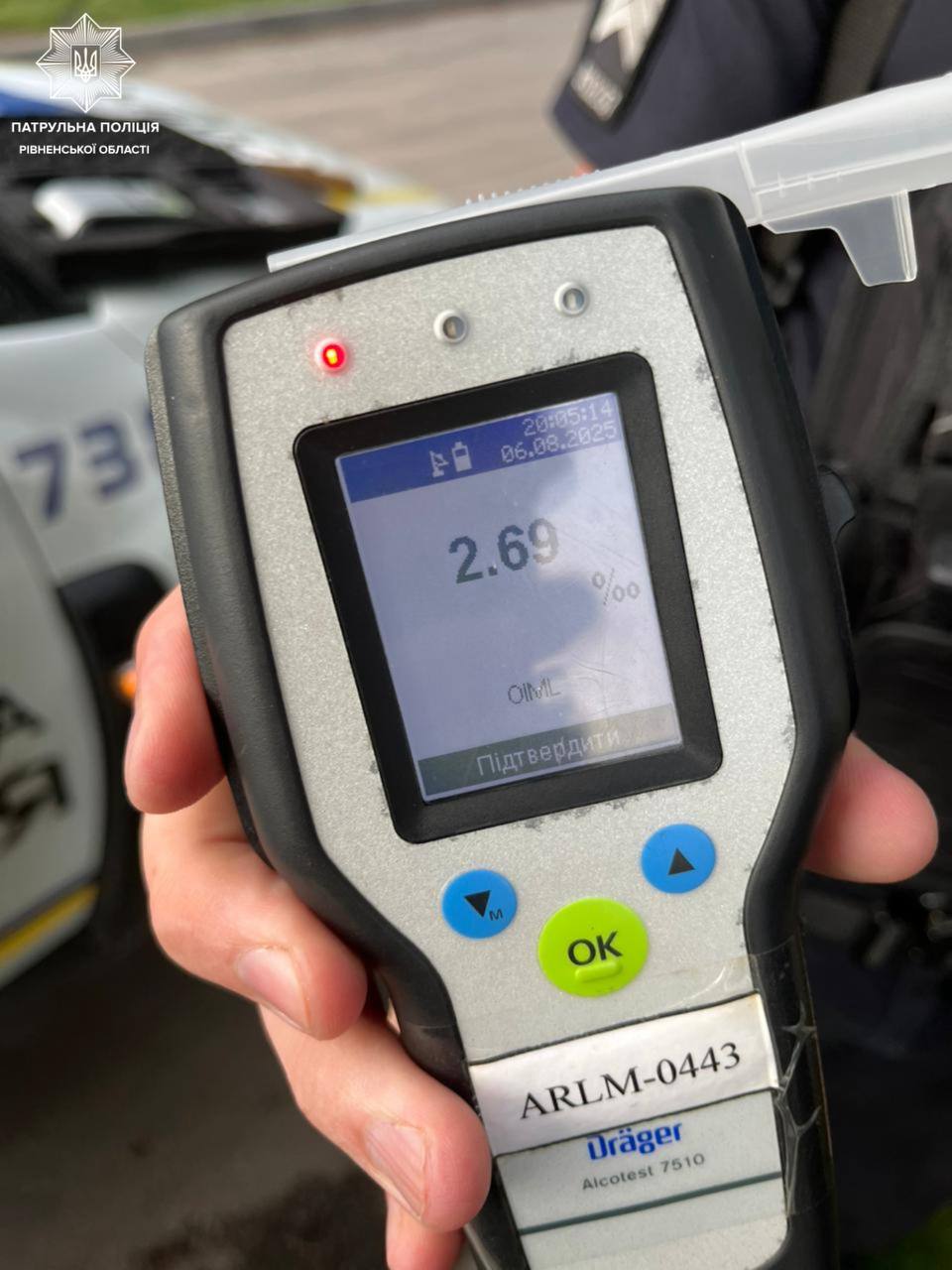 Чоловік погодився пройти огляд за допомогою алкотестера — результат виявився позитивним: 2,69 проміле.
