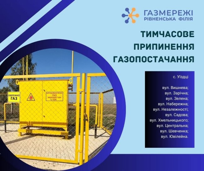 У зв’язку з цим буде тимчасово припинено газопостачання (розподіл природного газу) до 118 осель споживачів у с. Уїздці: на вулицях Вишнева; Зарічна; Зелена; Набережна; Незалежності; Садова; Хмельницького; Центральна; Шевченка; Ювілейна.