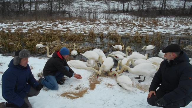 Фахівці Центру порятунку диких, екзотичних і домашніх тварин «Фельдман Екопарк» радять в період морозів підгодовувати лише тих лебедів, які ще не змінили пір’я, тобто віком до року. Ці птахи їдять овес, зерно, терті овочі, кукурудзу і розмочене сіно. А от хлібом диких птахів годувати не можна, бо від цього у них може бути ентерит (запалення слизової оболонки тонких кишок).