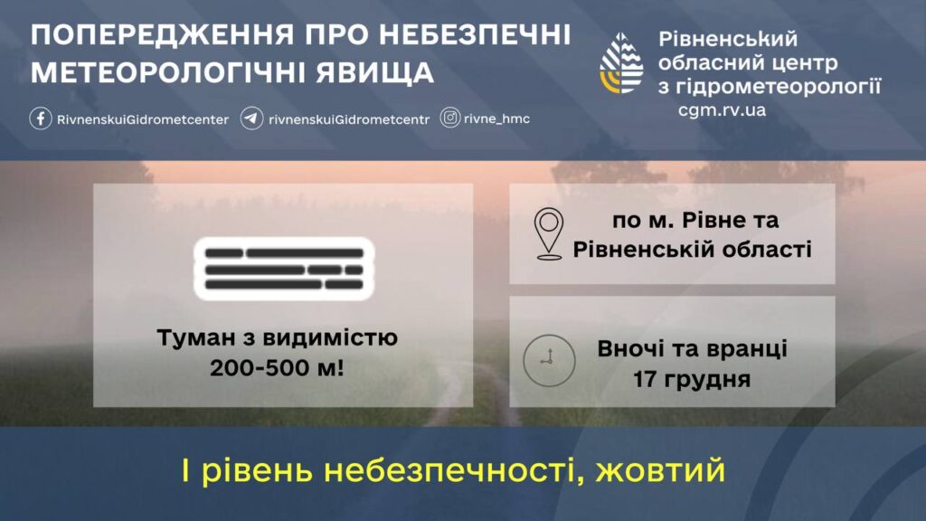 – Мінлива хмарність. Без опадів.  Вночі та вранці очікується туман 200-500м, 1-й рівень небезпечності –  жовтий. Вітер південний, 7-12 м/с, – прогнозують в обласному центрі з гідрометеорології.