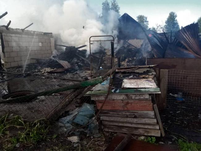 Вогнем знищено: дерев’яну будівлю криту шифером по дерев’яній обрешітці розміром 10х6 метрів, 4 тонни сіна, 5 м.куб. дров, господарський інвентар, дах та перекриття шлакоблочної господарської будівлі на площі 60 кв.м. Причина пожежі та розмір збитків встановлюються.