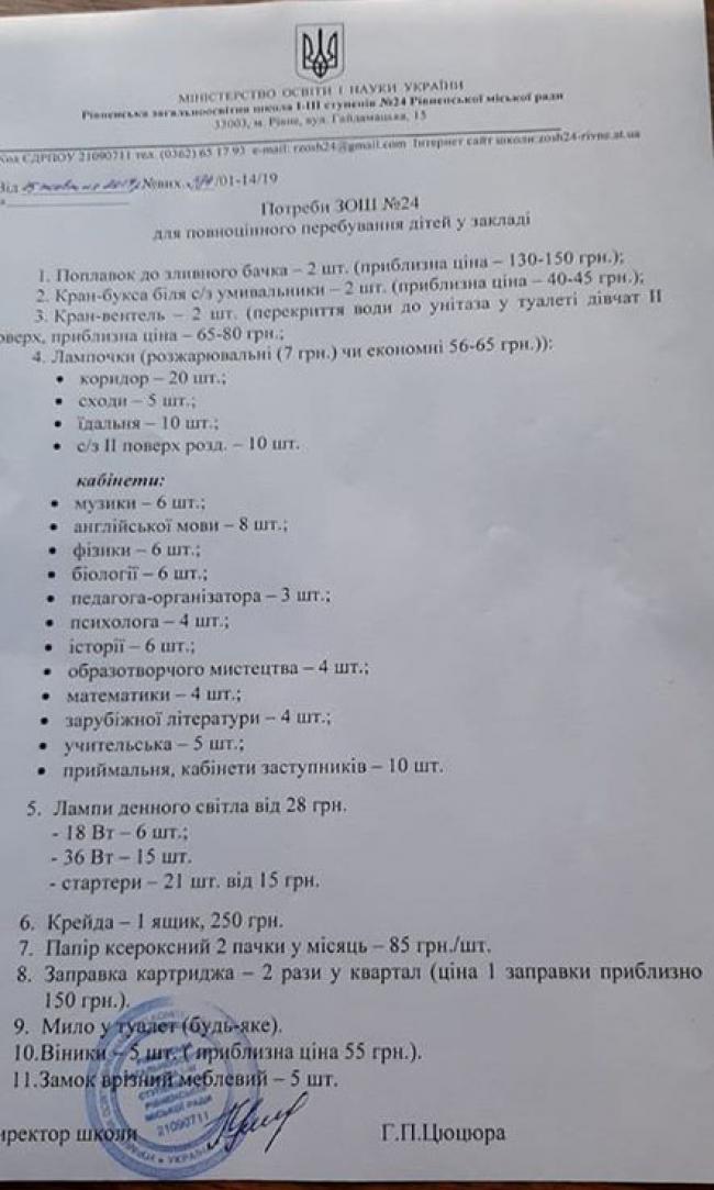 Фото списку з грифом Міністерства освіти і науки, підписом та печаткою директора школа опублікувала в соцмережі мама першокласника Надія Умурбаєва. «Чи нормально, що це має забезпечуватися батьками, а не бюджетом школи?» — обурилась жінка.