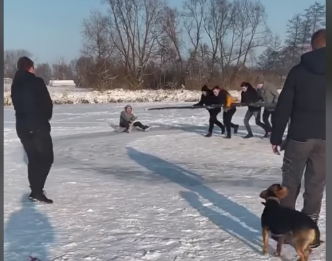 З нього видно, як шестеро хлопців на льоду катають ще одного. Задля цього вони до балки прикріпили мотузку, за яку тримався чоловік.