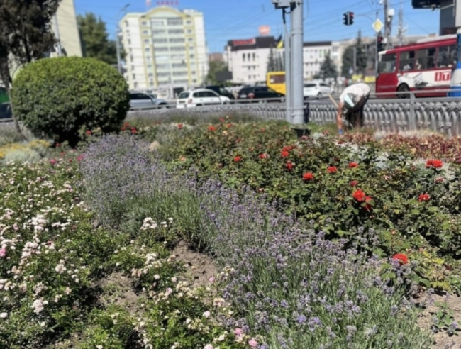 Як приклад, ось ця клумба біля центрального універмагу. Тут працівники ТЗГ висадили однорічні та багаторічні рослини, такі як петунія, лаванда, гейхера, троянди, сантоліна.