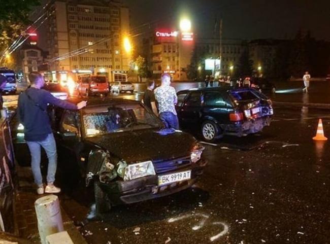 Як повідомили очевидці події у групі Rivne_1283 в Instagram, зіткнулися чотири автівки. Одну з них викинуло на пішохідну частину майдану Незалежності.
