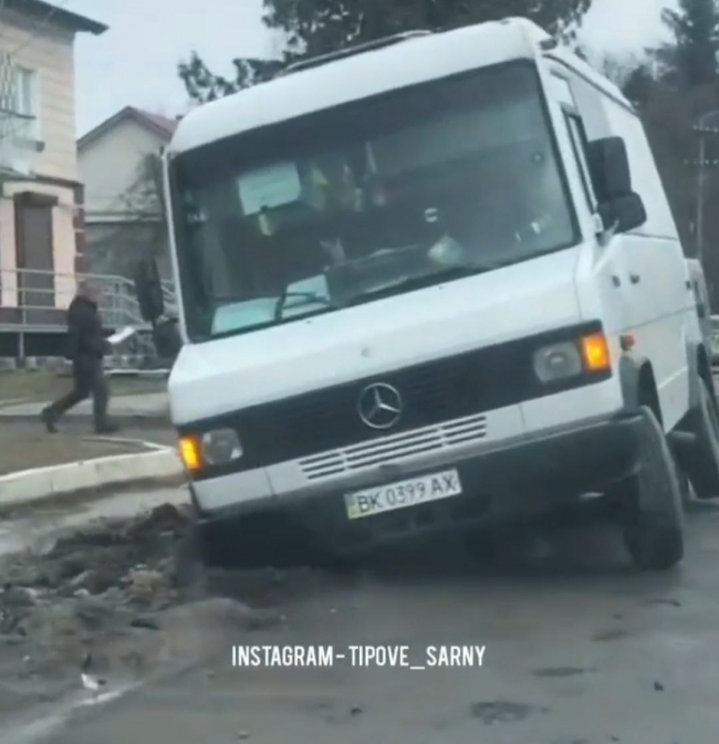 У центрі Рокитного маршрутка застрягла у вибоїні