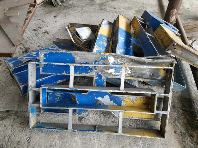 Стела наразі у розібраному вигляді: у комплекті всі букви, частково розібрані для оцінки та зважування. Частина з них виготовлена із алюмінію, а інша – зі сталі. Літери легко відновлюються до потрібного стану. Початкова ціна – 7465.00грн. (вона відповідає вартості оприбуткування металобрухту. Лот включає у себе 563 кг чорних металів (на суму 2815 грн.) та 155 кг (кольоровий метал, алюміній), на суму 4650 грн.