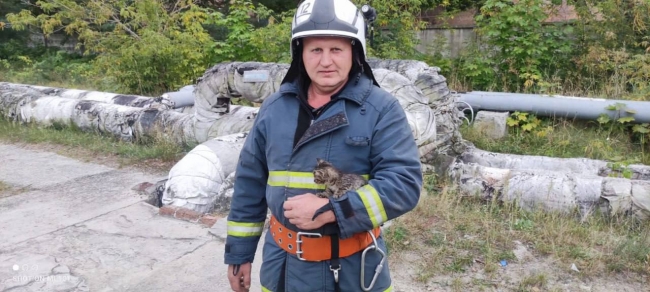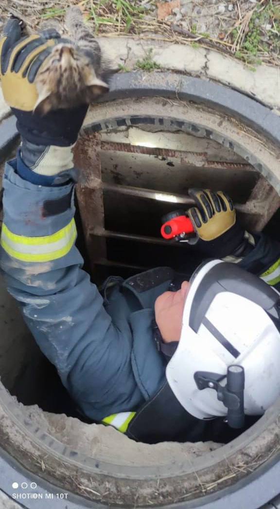 За допомогою драбини співробітник ДСНС спустився на дно ями та дістав чотирилапого. На щастя з котиком все добре.