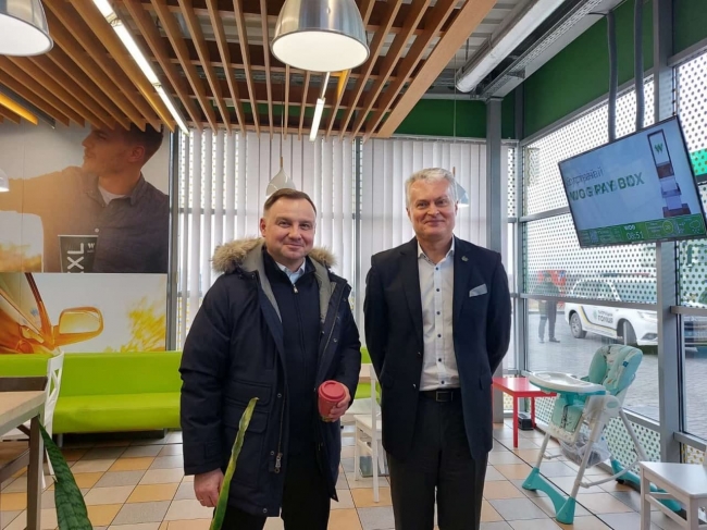 Президентські автомобілі супроводжувалися машинами української поліції. Авто Дуди і Науседи заправили «до повного», після чого президенти і їх супроводжувачі взяли каву у приміщенні кафе АЗС.