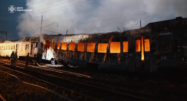 – На ліквідацію пожежі вогнеборці відразу ж подали вогнегасні речовини. На жаль, внаслідок пожежі вагон був знищений, проте врятовано два вагони від вогню. Жертв та постраждалих внаслідок пожежі немає, – розповіли у ГУ ДСНС Рівненщини.