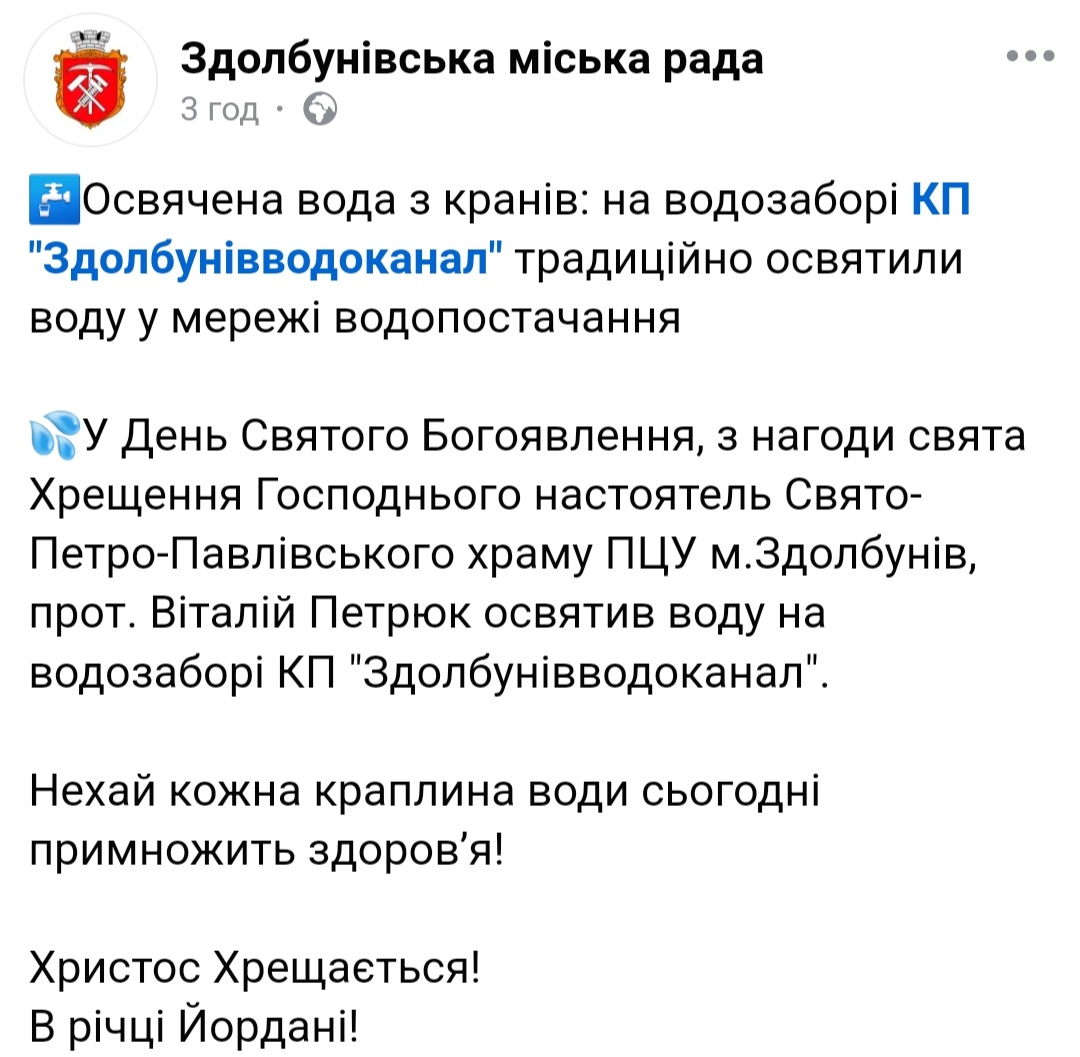 Новини У Здолбунові з кранів сьогодні тече освячена вода Це уже традиція. admin 6 Січня, 21:00 0 хв. читання Поділитися Розшукують 74-річного жителя Березнівщини Ремонт туалетів у міській раді Рівного коштуватиме понад 3 мільйони гривень У Рівному військовий не повернувся з лікарні на службу і сів на 5 років У працівників суду на Рівненщині – професійне свято Незаконний виїзд за $200: на Сарненщині затримали переправника Поділитися цією статтею Facebook Telegram Копіювати посилання Приєднуйтесь 58тисСтежити1.2тисСтежити13.9тисСтежити6.1тисПідписатися Читайте нас у Telegram: тільки важливі та перевірені новини Новини 15 Грудня 2025 Розшукують 74-річного жителя Березнівщини 20:00 Ремонт туалетів у міській раді Рівного коштуватиме понад 3 мільйони гривень 19:35 У Рівному військовий не повернувся з лікарні на службу і сів на 5 років 19:00 У працівників суду на Рівненщині – професійне свято 18:17 Незаконний виїзд за $200: на Сарненщині затримали переправника 18:15 Відбілити пластик, що пожовтів 17:40 Інноваційний препарат для лікування меланоми привезуть в Україну у наступному році 17:01 Чи чекати на Рівненщині снігу цього тижня? 16:30 У Рівному знову велика потреба у донорах крові – для поранених з інших областей 16:00 Рієлторка незаконно продала чужу квартиру у Рівному за понад 2 мільйони гривень 15:25 Всі новини