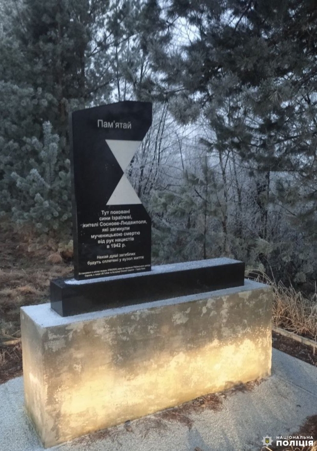 – Оприлюднений факт підтвердився — невідома особа пошкодила меморіальну дошку, встановлену євреям, жителям Соснового-Людвиполя, які загинули від рук нацистів, – розповіли в обласній поліції.