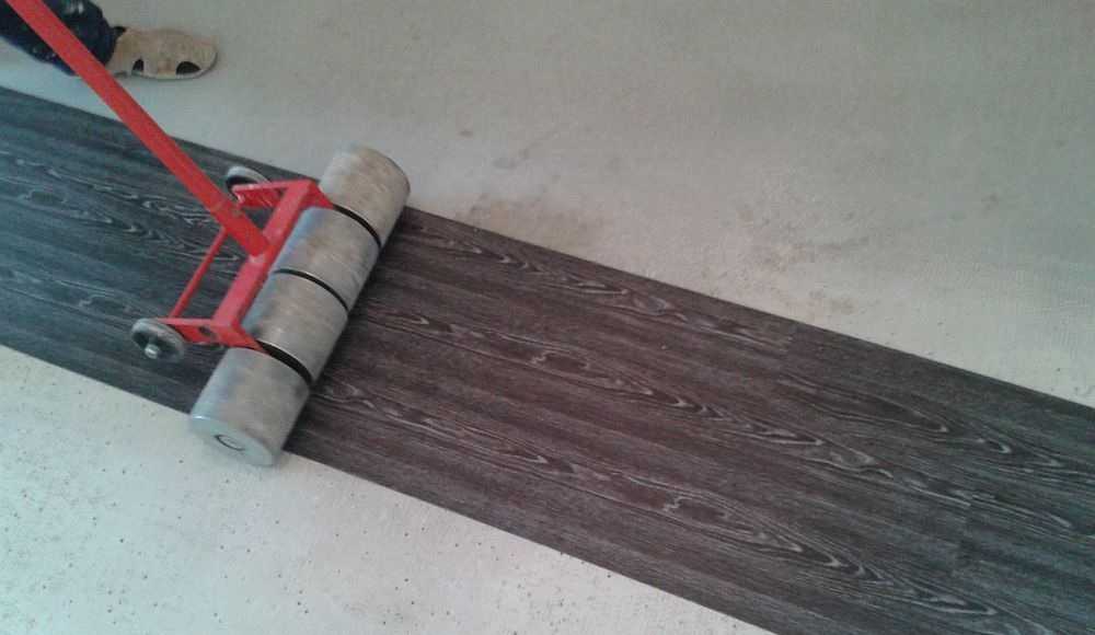 3. Для Укладання на клей вінілової плитки вам знадобиться спеціальний валик з максимальною вагою – Бажано той валик на який ваш партнер по укладанню може сісти, створивши максимальне навантаження. Таким чином проникність клею в усі пори-буде максимальна і зкріплення вінілу зі стяжкою – буде найнадійніше, і найголовніше – що в момент монтажу у вас не попливуть ряди вінілової плитки, при проклейці наступних рядів.