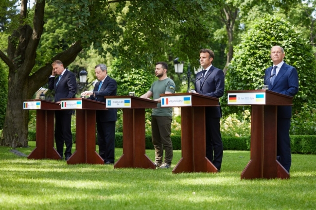 «Завтра Європейська комісія виступить з висновком, а наступного тижня Європейська рада ухвалюватиме рішення щодо європейської перспективи України. І ми всі вчотирьох підтримуємо надання Україні статусу кандидата на вступ у Європейський Союз», – сказав Макрон.