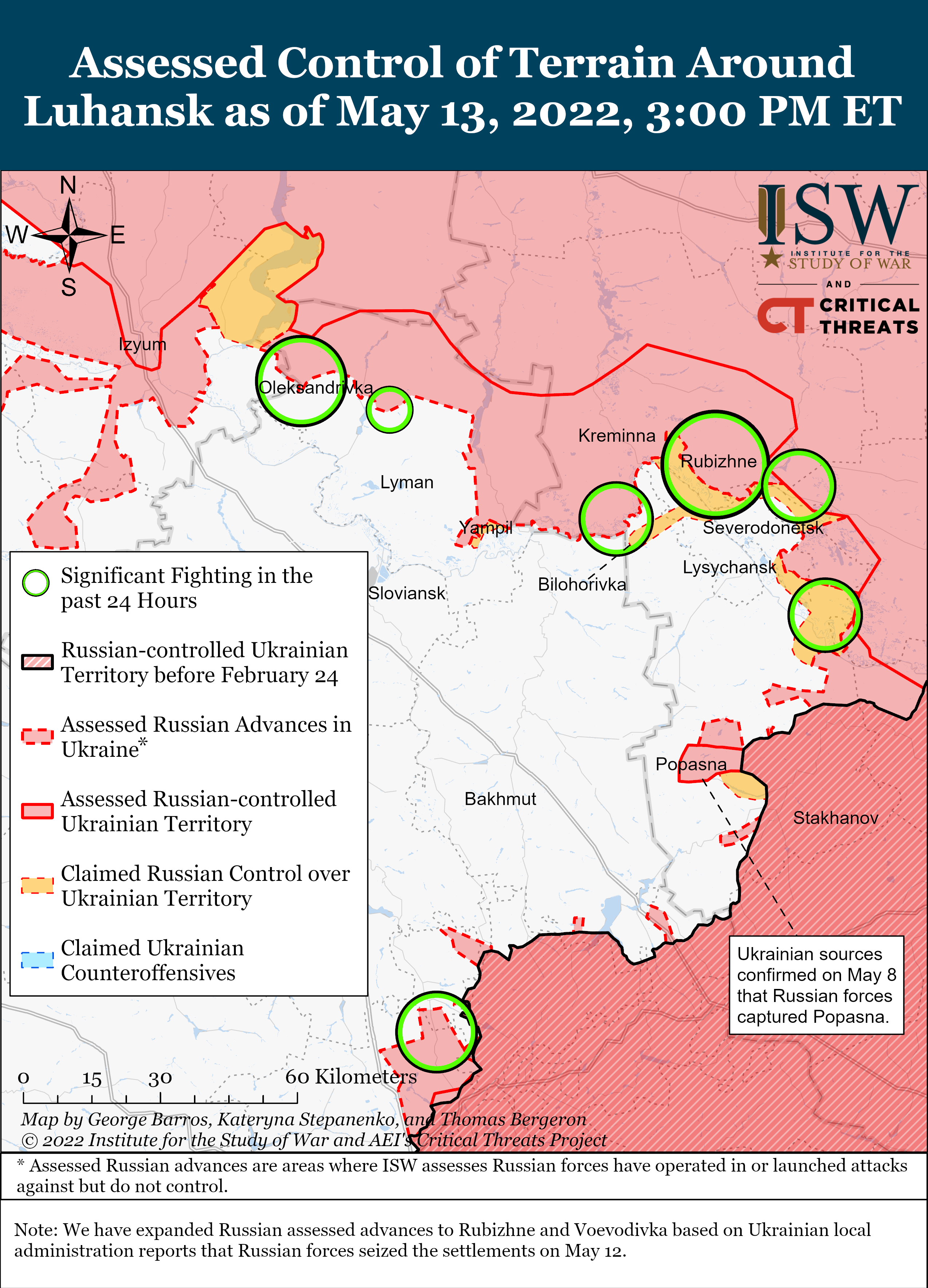 Наразі основні зусилля російських військ спрямовані на те, щоб оточити Сєвєродонецьк і Лисичанськ з півночі і з півдня.