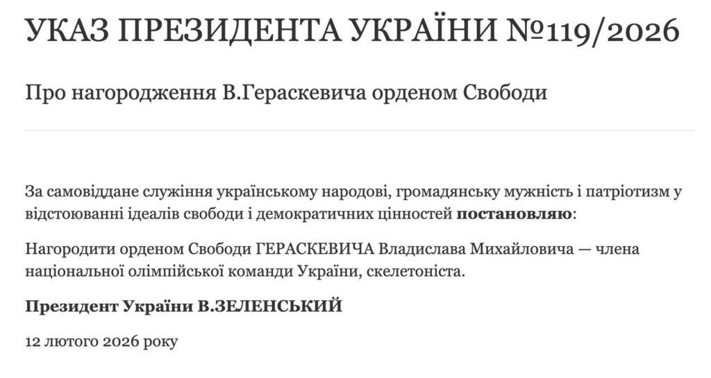 – Це Росія постійно порушує олімпійські принципи і використовує час проведення Олімпіади для війни. У 2008-му – війна проти Грузії, у 2014-му – окупація Криму, у 2022-му – повномасштабне вторгнення в Україну. І зараз, у 2026-му, попри численні заклики припинити вогонь на час проведення зимових Олімпійських ігор – повна зневага з боку Росії і збільшення ударів ракетами й дронами по нашій енергетиці та наших людях. 660 українських атлетів і тренерів були вбиті Росією за час повномасштабної війни. Сотні наших спортсменів більше ніколи не зможуть взяти участь ні в Олімпійських іграх, ні в будь-яких інших міжнародних змаганнях. Але при цьому 13 росіян зараз в Італії і беруть участь в Олімпіаді. Це на Олімпійських іграх вони під «нейтральними» прапорами, а в житті публічно підтримують російську агресію проти України та окупацію наших територій, – нагадав президент.
