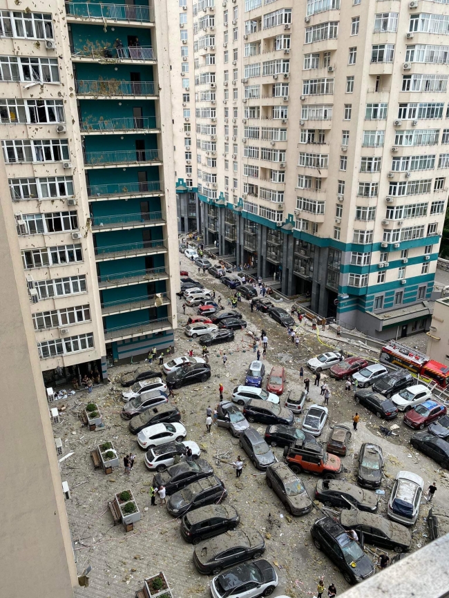 Під час повітряної атаки було пошкоджено три поверхи у цьому багатоквартирному житловому будинку. Сталося часткове руйнування конструкцій. З будинку врятували 22 людини. В дворі було багато пошкоджених автівок.