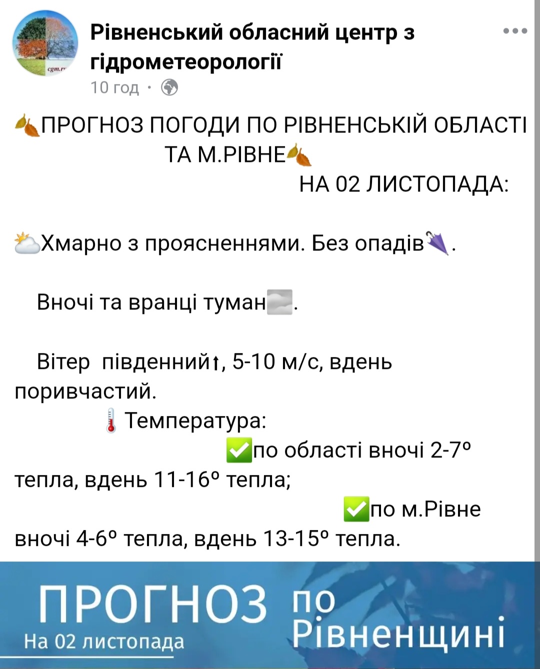 – 2 листопада вночі та вранці очікується туман з видимістю 200-500 м. 1 рівень небезпечності, жовтий, – йдеться у прогнозі рівненських синоптиків.