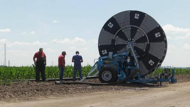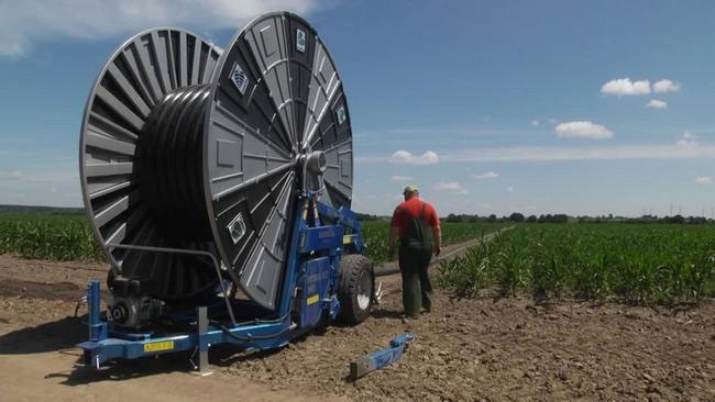 — Зрошувальні системи забезпечують вологою рослини в критичні строки. Зараз, коли температура понад 30 градусів тепла, опадів немає, ми можемо забезпечити рослини вологою відповідно до потреби. На даний час даємо 20-25 мм опадів. На полі працює 4 поливних котушки, дві з них по 520 м, дві — по 680 м. Одна така машина може поливати в середньому від 6 до 8 гектарів за добу. Поливні машини працюють від стаціонарної насосної станції. Одночасно є два контури поливу. Котушка, рухаючись міжряддям, намотує на себе пластикову трубу і гідрант, який поливає і розбиває воду, що падає на культури у вигляді проливного дощу. Неподалік бачимо ще дві котушки, що працюють від валу відбору потужності тракторів, — демонструє роботу сучасної диво-техніки агроном.