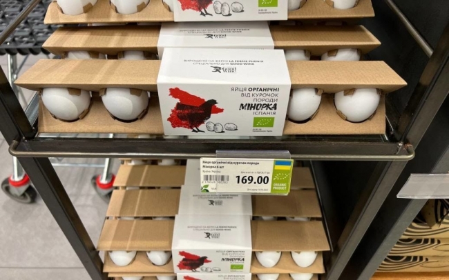 Так, десяток таких яєць коштуватиме 281,60 грн. На упаковці вказано, що яйця «органічні» від курочок породи мінорка. Вони привезені з Іспанії.