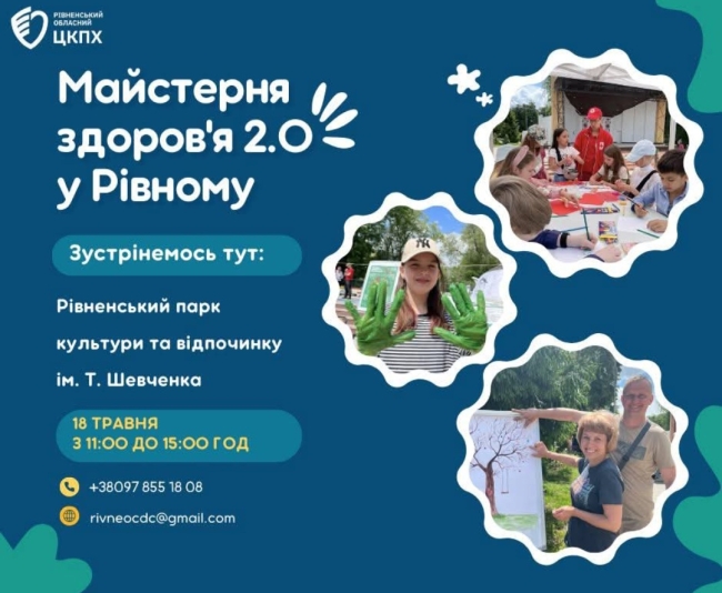 – Запрошуємо дітей і дорослих на яскраву подію до Європейського тижня громадського здоров’я — МАЙСТЕРНЮ ЗДОРОВ’Я 2.0, яка відбудеться 18 травня з 11:00 до 15:00 у Парку культури та відпочинку імені Т.Г.Шевченка, – кажуть в обласному центрі контролю та профілактики хвороб.