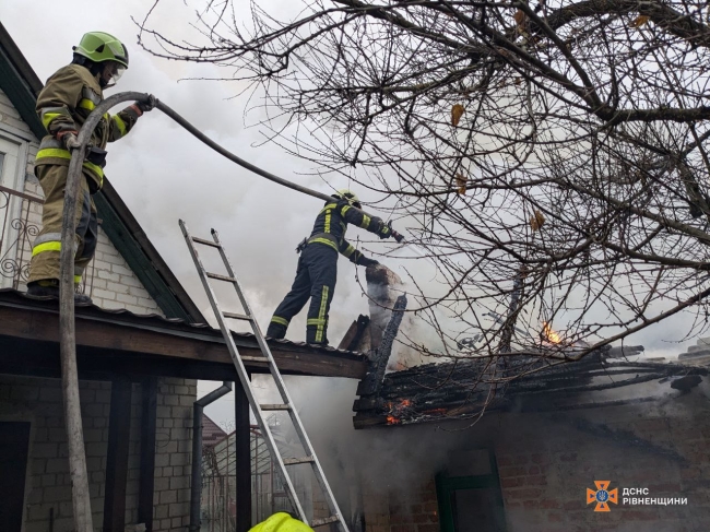 – Пожежа виникла у господарській будівлі розміром 4х3 м. На ліквідацію оперативно було подано вогнегасні речовини. Вогнем знищено покриття та перекриття господарської будівлі. Жертв та постраждалих немає. До ліквідації було залучено дві автоцистерни та сім рятувальників, – розповіли у ГУ ДСНС Рівненщини.